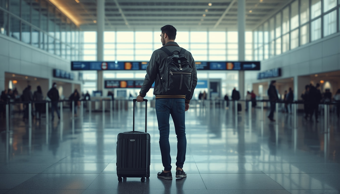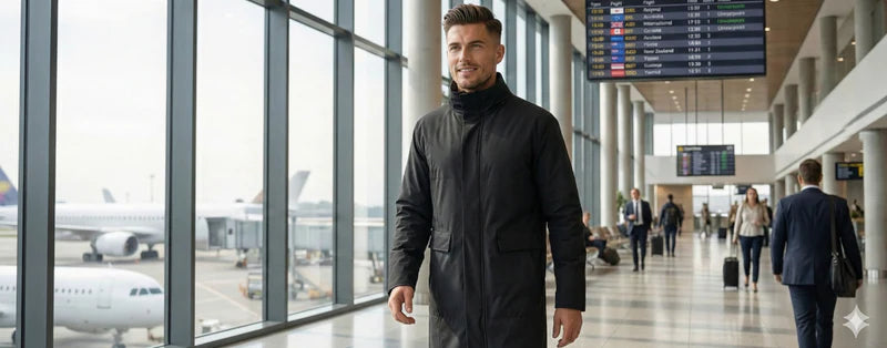 Reisende tragen ihren Stauraum am Körper. Kleidung und das Nötigste passen in die Jacke, kein Handgepäck nötig, keine Gepäckgebühren und freihändiges Bewegen am Flughafen.